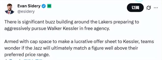 ESPN記者文霍斯特多次指出,湖人是凱斯勒的合理下家,并質疑爵士是否真的愿意把大部分可用薪金空間砸在三名前場球員身上。