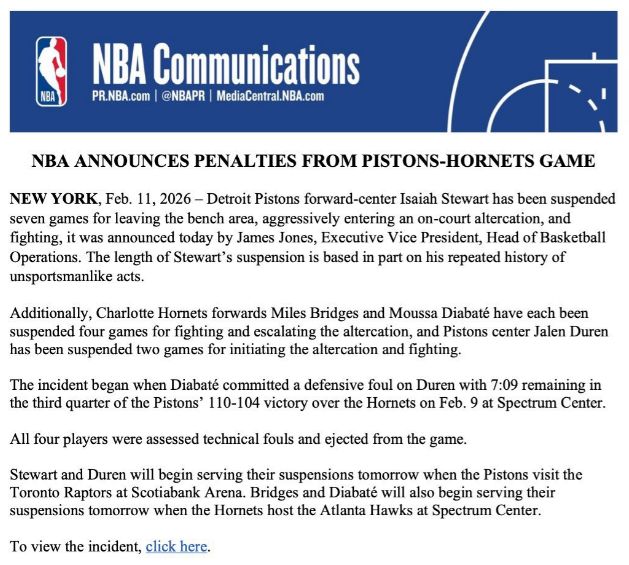 活塞球員斯圖爾特和杜倫的禁賽,將從2月12日開始執行,他們將無緣活塞客場對陣猛龍的比賽,之后也將繼續禁賽。至于布里奇斯和迪亞巴特的禁賽,也將從2月12日開始執行,屆時黃蜂主場迎戰老鷹。