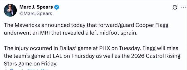 北京時間2月12日,獨行俠官方宣布,狀元弗拉格接受了核磁共振檢查,結果顯示為左腳中部扭傷。這次受傷發生在周三獨行俠客場對陣太陽的比賽中。弗拉格將缺席周五對陣湖人的比賽,也不會參加周六舉行的2026年全明星新星賽。