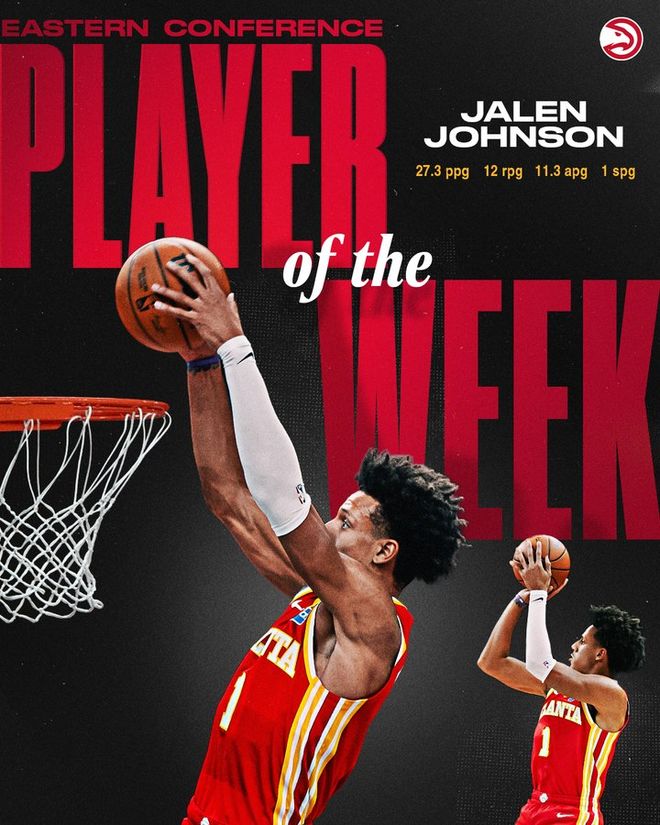 賽季至今,約翰遜場均23.4分10.6籃板8.2助攻,投籃命中率50.2%。老鷹26勝28負,暫列東部第九。